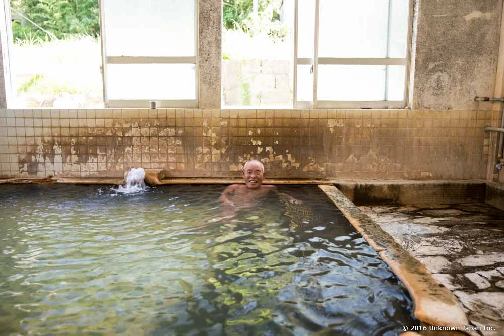 常連の清高さん。源泉が鉱山からの引湯になる前から通われているそうです。キズによく効く、ということでした。