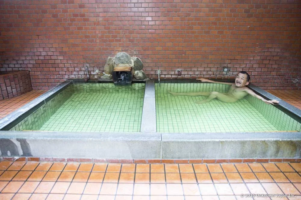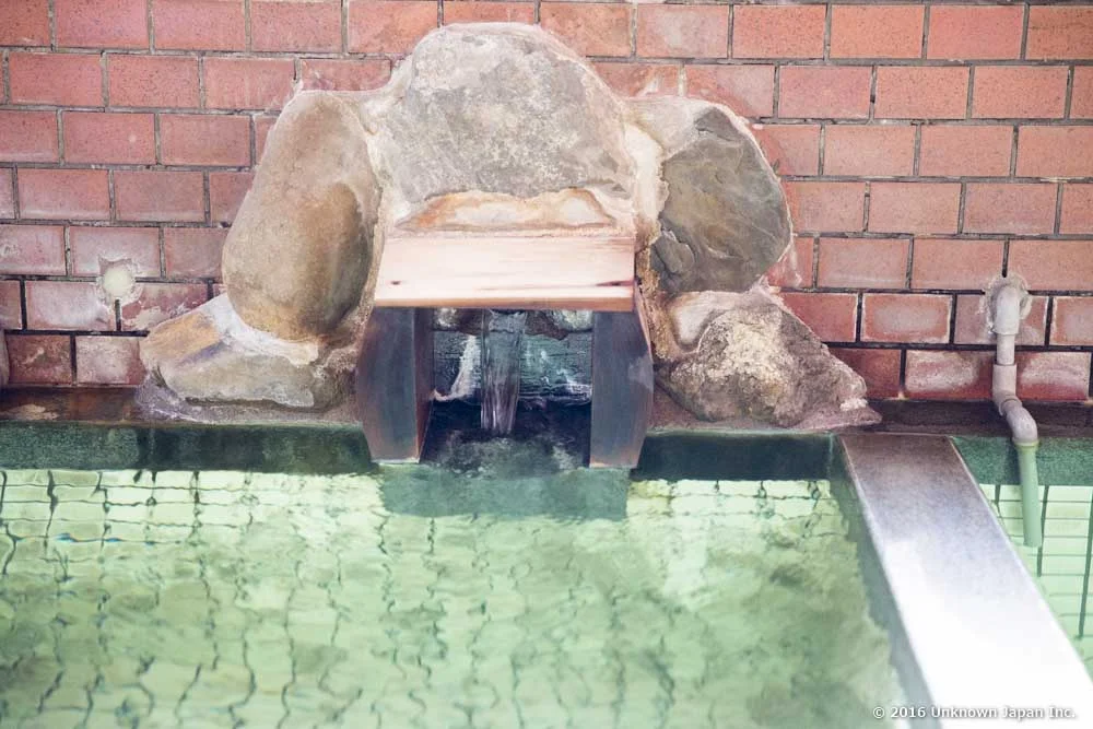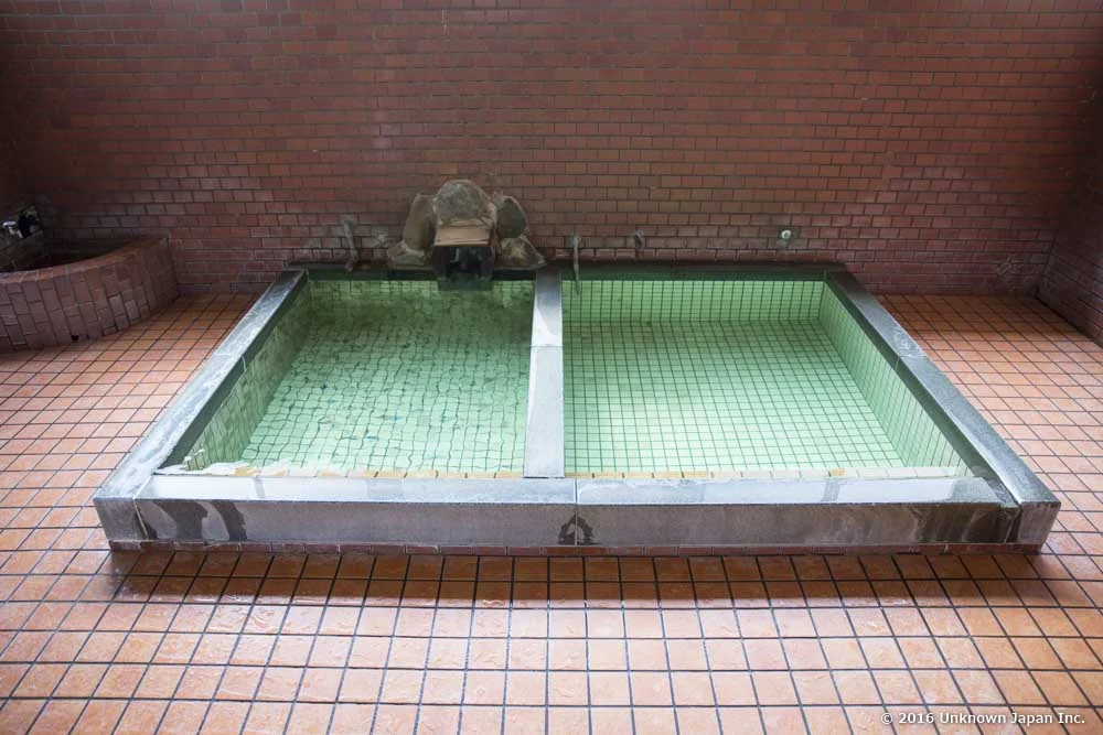 お湯の色が透き通っています。綺麗なエメラルドグリーンの硫黄泉です。鄙びた雰囲気の中にオレンジのタイルと緑のお湯の色がマッチしています。入るとツルツルとしており、お客さんには「鹿児島トップクラスの泉質だよ」と言われることもあるそうです。