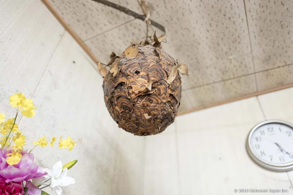 元食堂スペースにはスズメバチの巣が4つほど飾ってあります。和見さん曰く、「魔除け」だそうです。