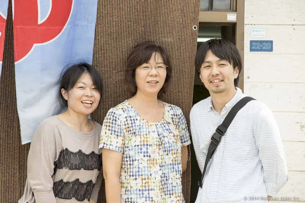 管理人の徳田正子さん(真ん中)と入口で撮影