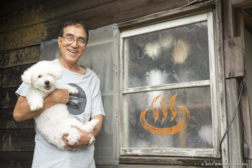 久雄さんと看板犬の凛(りん)ちゃん。やまでら鉱泉の歴史は約40年ですが、ここで使用されている源泉の歴史は平安・鎌倉時代からあるのではないかとのこと。平家の落人伝説で有名な近くの吉ヶ別府地区に弘法大使が泊まったという伝説があり、弘法大師はきれいな水のある場所にしか行かなかった言われていることから、その時代にはすでに源泉の存在が知られており、かつ、弘法大使もこの鉱泉に浸かったのはないか、ということです。