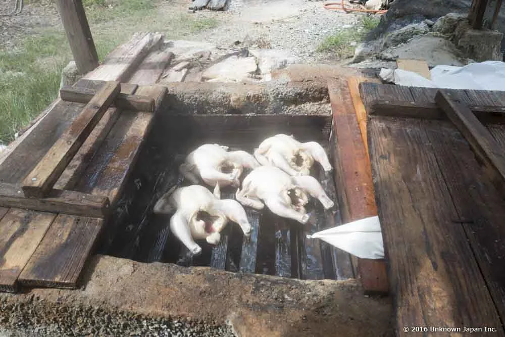 南洲館名物の蒸し鶏です。温泉の蒸気で蒸された丸ごとの鶏は成分をしっかり吸って美味とのこと。贈り物などにも良く、取材時にはお客さんが一人で6羽も購入されてました。事前予約が必須ですので、欲しい方はお忘れなく。