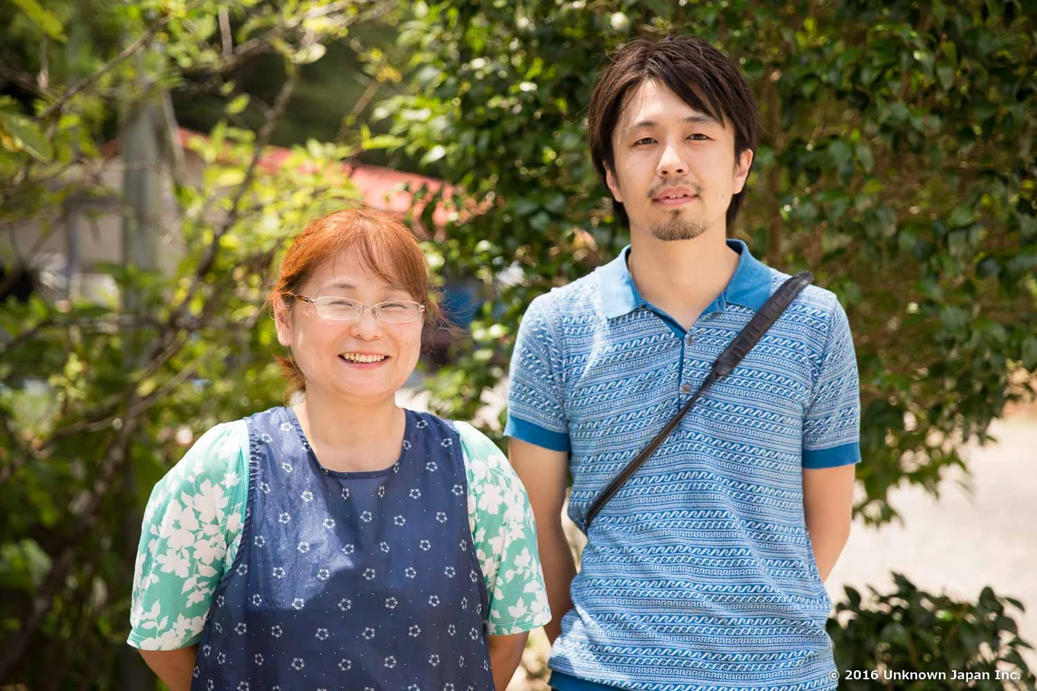 オーナーのご家族の松田珠世さんと入口前にある庭で撮影