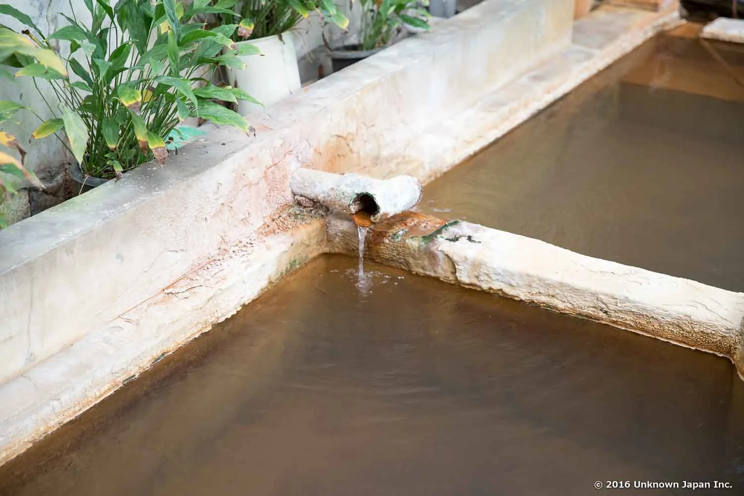 湯口は一つのパイプが2つに分かれ、かつ少し傾いて設置されています。流入する湯量によって温度を調節しているようです。泉質は炭酸水素塩泉であり、疲労回復には特に効くとのことです。またアトピーなどの皮膚病にも良いとのこと。