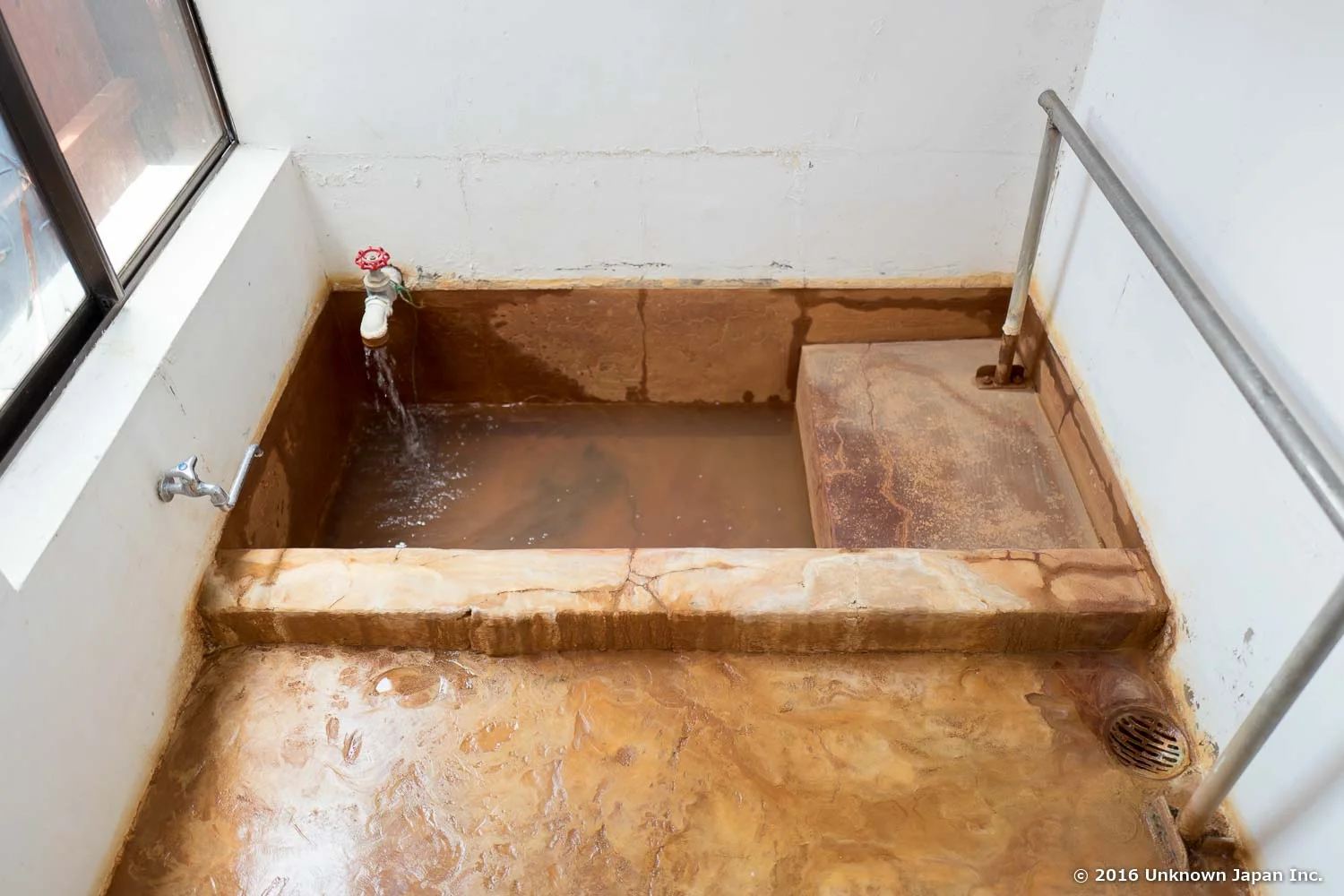 浴場は一面茶色の世界で、温泉の成分の強さが伺えます。浴槽は2つあり、手前がぬる湯、奥があつ湯となっており、また奥には勢いのある打たせ湯が流れています,