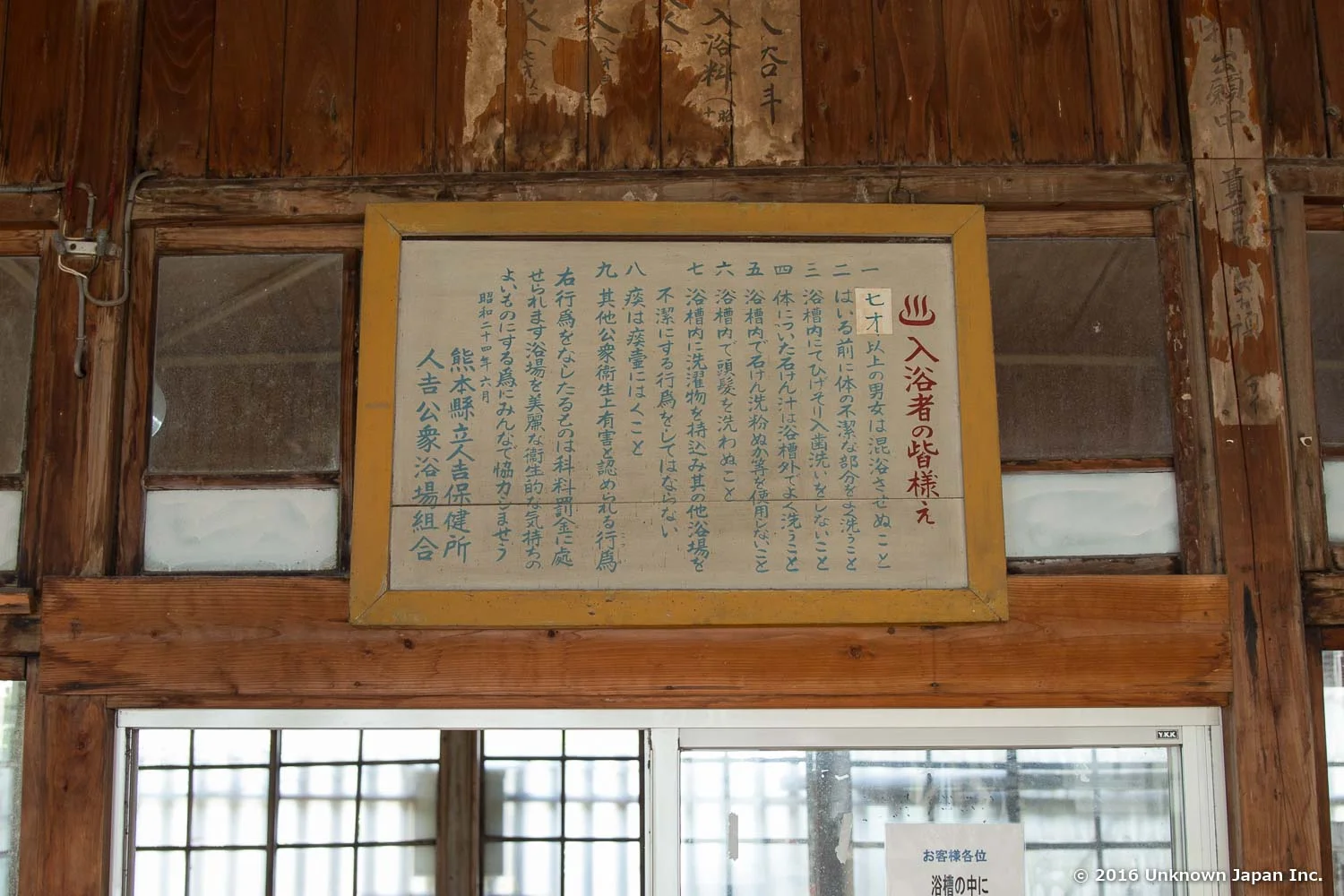 入浴者への注意書きです。右上に「七才以上の男女は混浴させぬこと」とありますが、昔は「七才」ではなく、「十三歳」だったそうです。それが「十歳」になり、「七歳」になり、と低年齢化しているそうです。子供の成長が早くなったんだね、と明廣さん。
