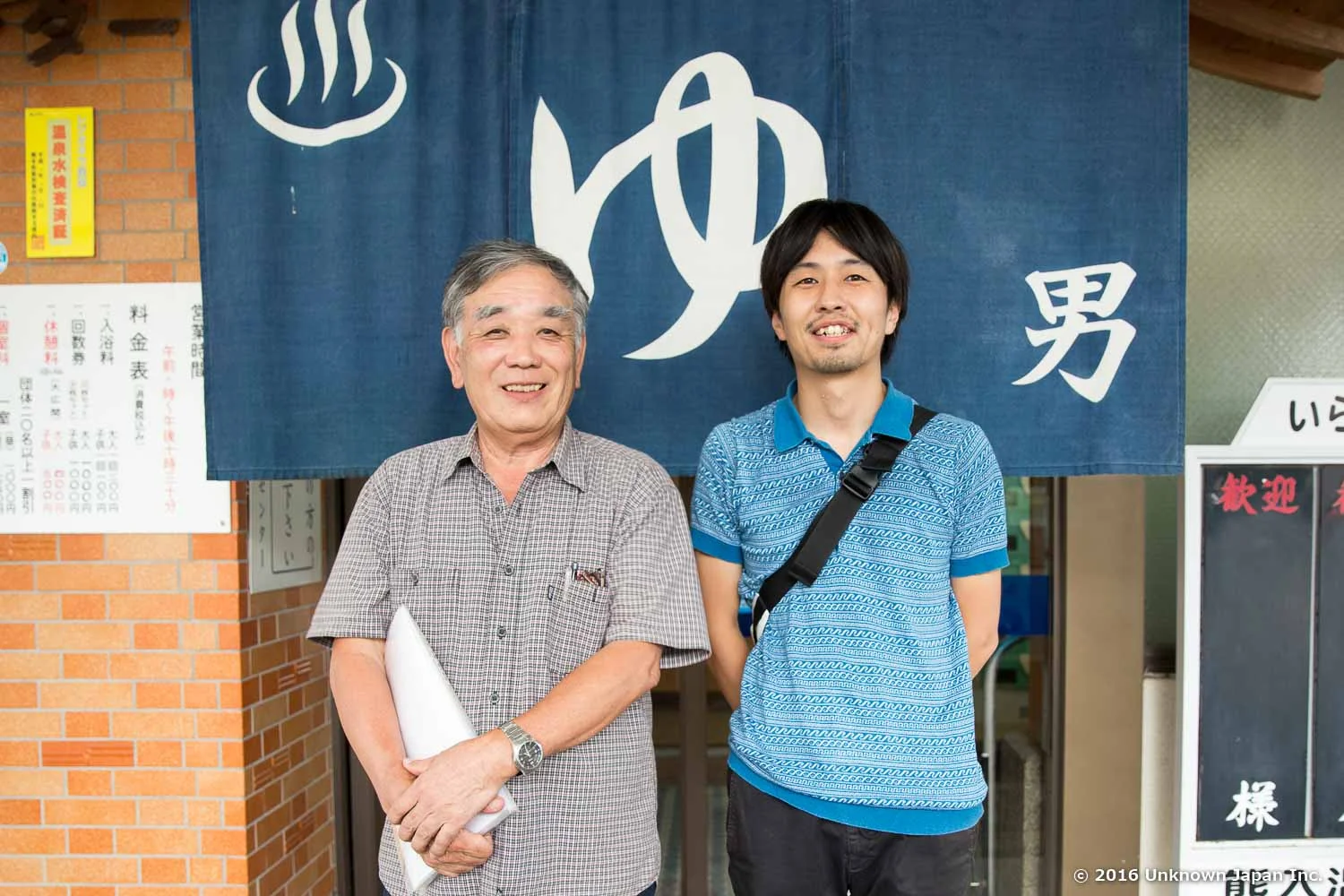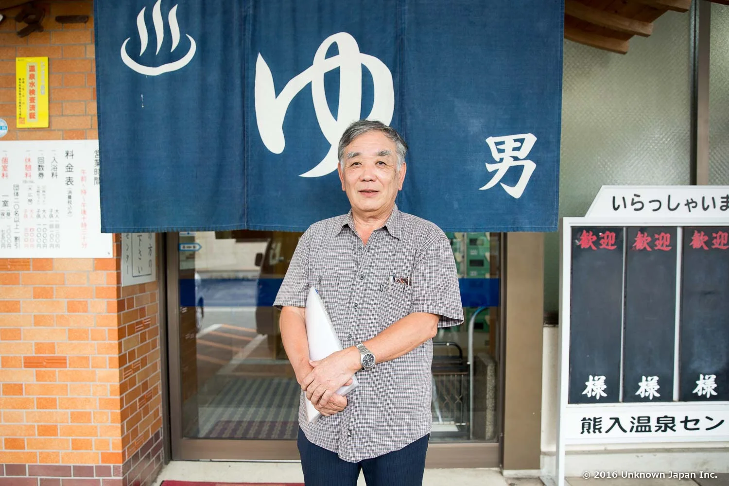 熊入温泉共親会会長の中原進さんと入口で撮影