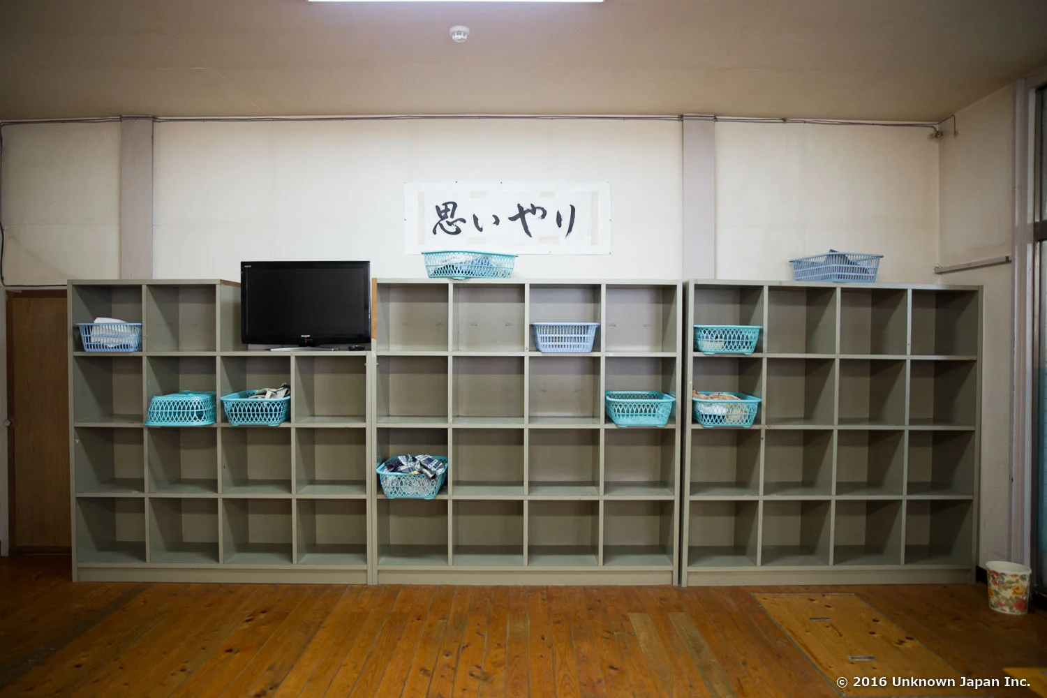 脱衣所です。鍵付きロッカーも併設されています。毎日、たくさんのお客さんがいらっしゃるため、棚の数がかなり多いです。ロッカーの上には「思いやり」。たくさんの人で使うからこそ、ひとりひとりの「思いやり」が大事ということですね。