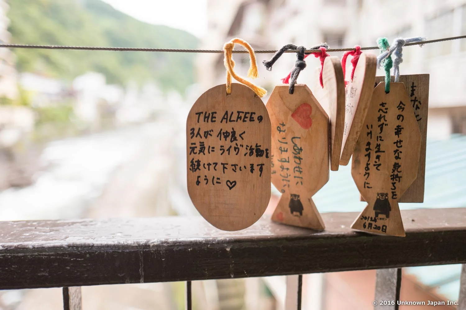 杖立川には3つの橋がかかっているのですが、そのうちの一つ、紅葉橋には絵馬のようなものが大量に飾られていました。これを見ながら歩くのも楽しいです。幾つか目についたものを紹介します。
