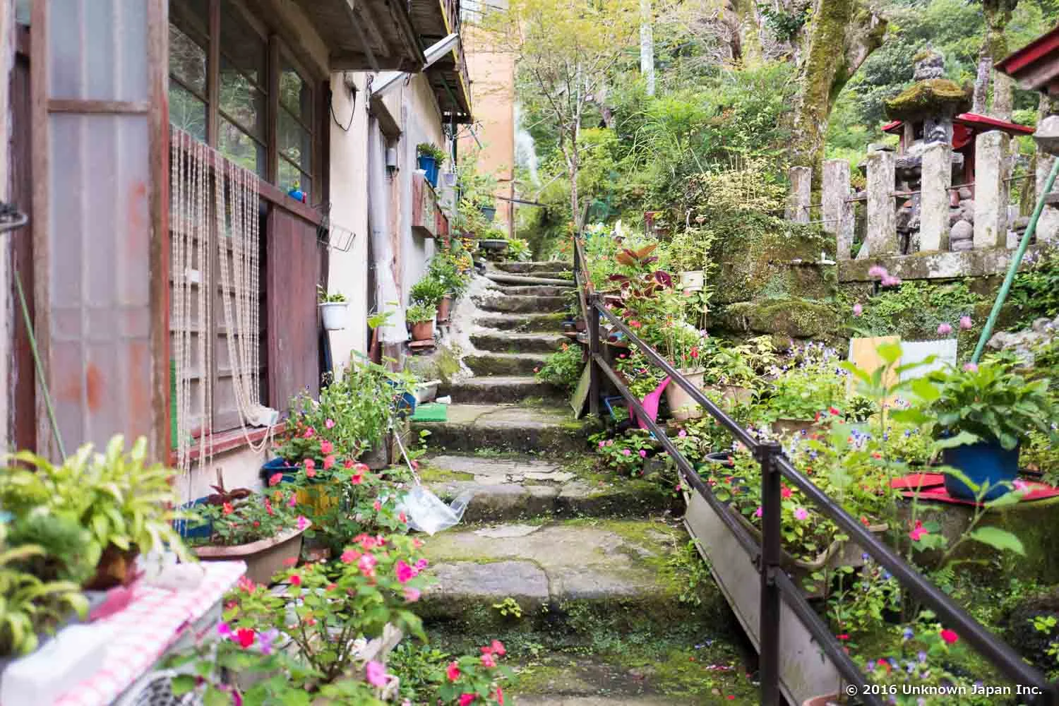 杖立温泉の散策が楽しかったので少しご紹介します。こちらは背戸屋(せどや)と呼ばれる路地裏です。杖立の町は川と山に囲まれており、狭い土地にたくさんの建物を立てる必要があったために、このような空間が至るところにできたそうです。こういう場所は写真を撮りたくなりますね。