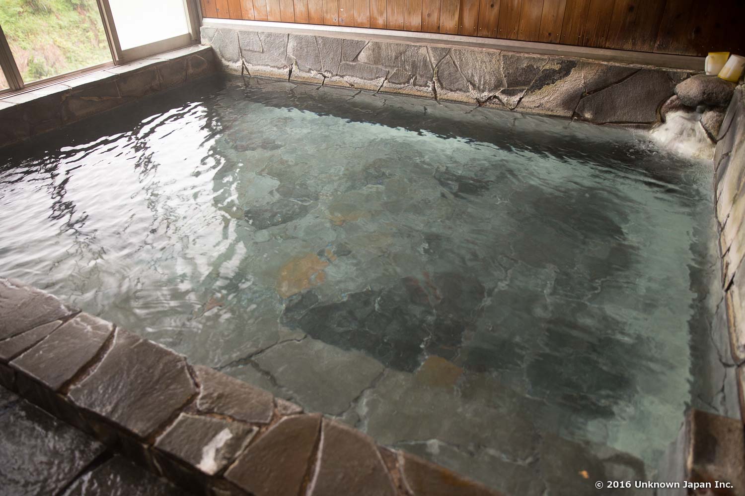 浴槽です。泉質は近くの「山川温泉 共同浴場」とよく似た硫黄泉で、大量の湯の華を確認できます。今でもすごいのですが、以前は豆腐のおからみたいにさらに大きい湯の華だったそうです。