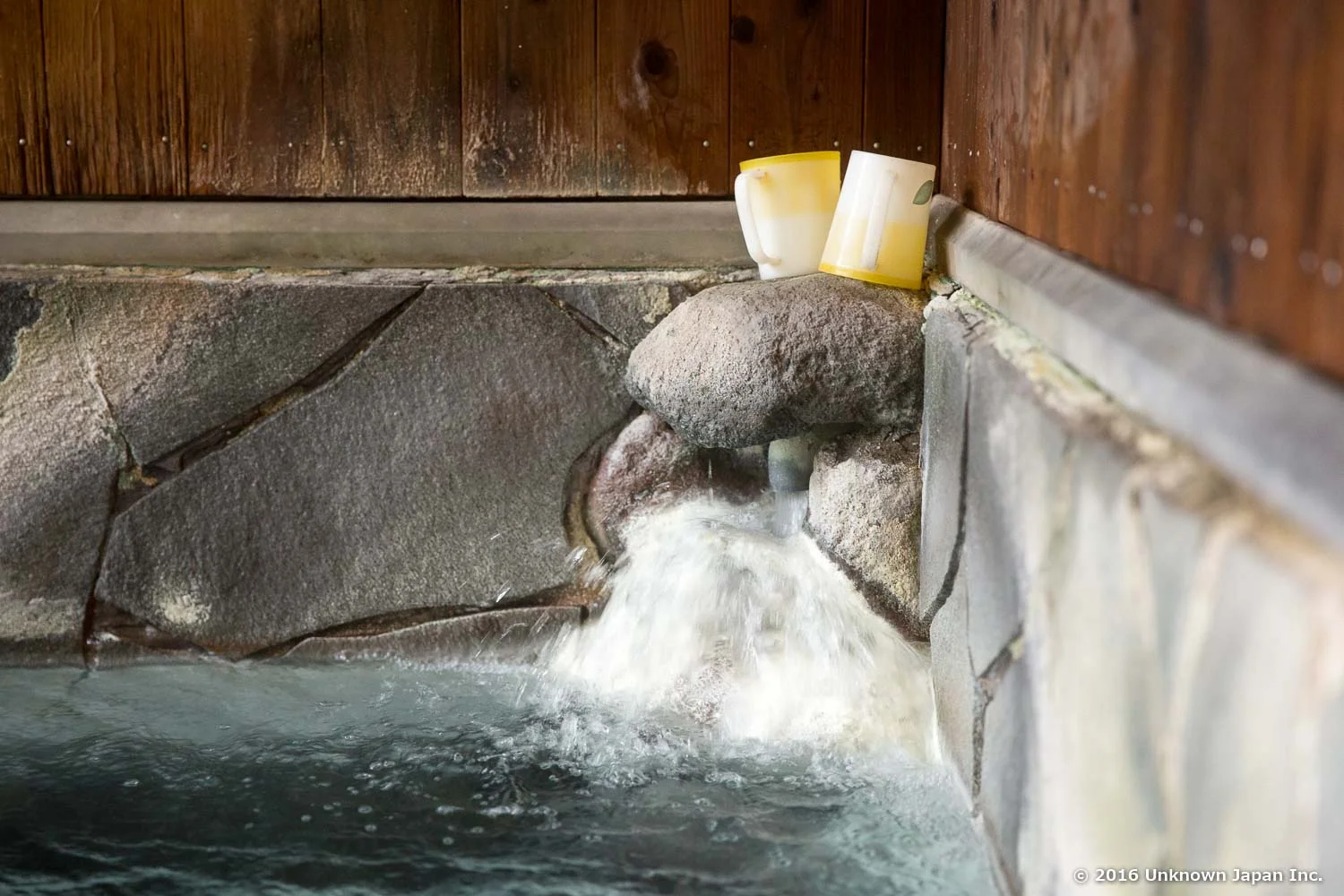 湯口からは大量のお湯が掛け流されています。硫黄成分で湯口付近は白くなっています。