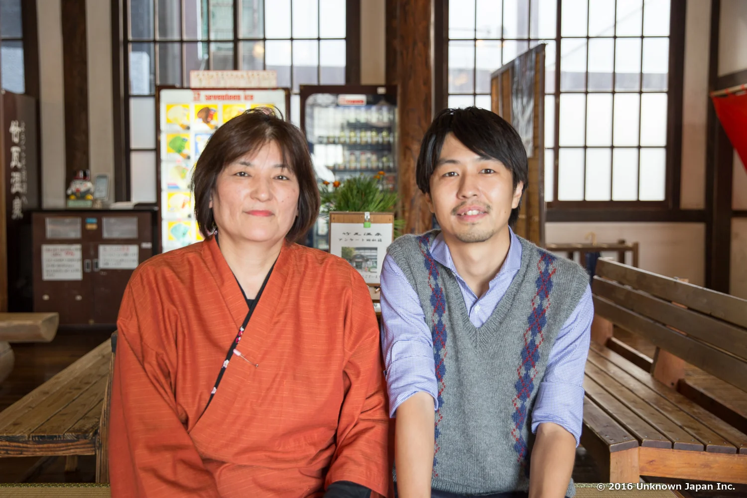 受付をされている脇節代さんと館内の休憩スペースで撮影