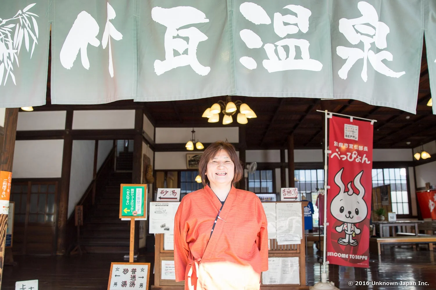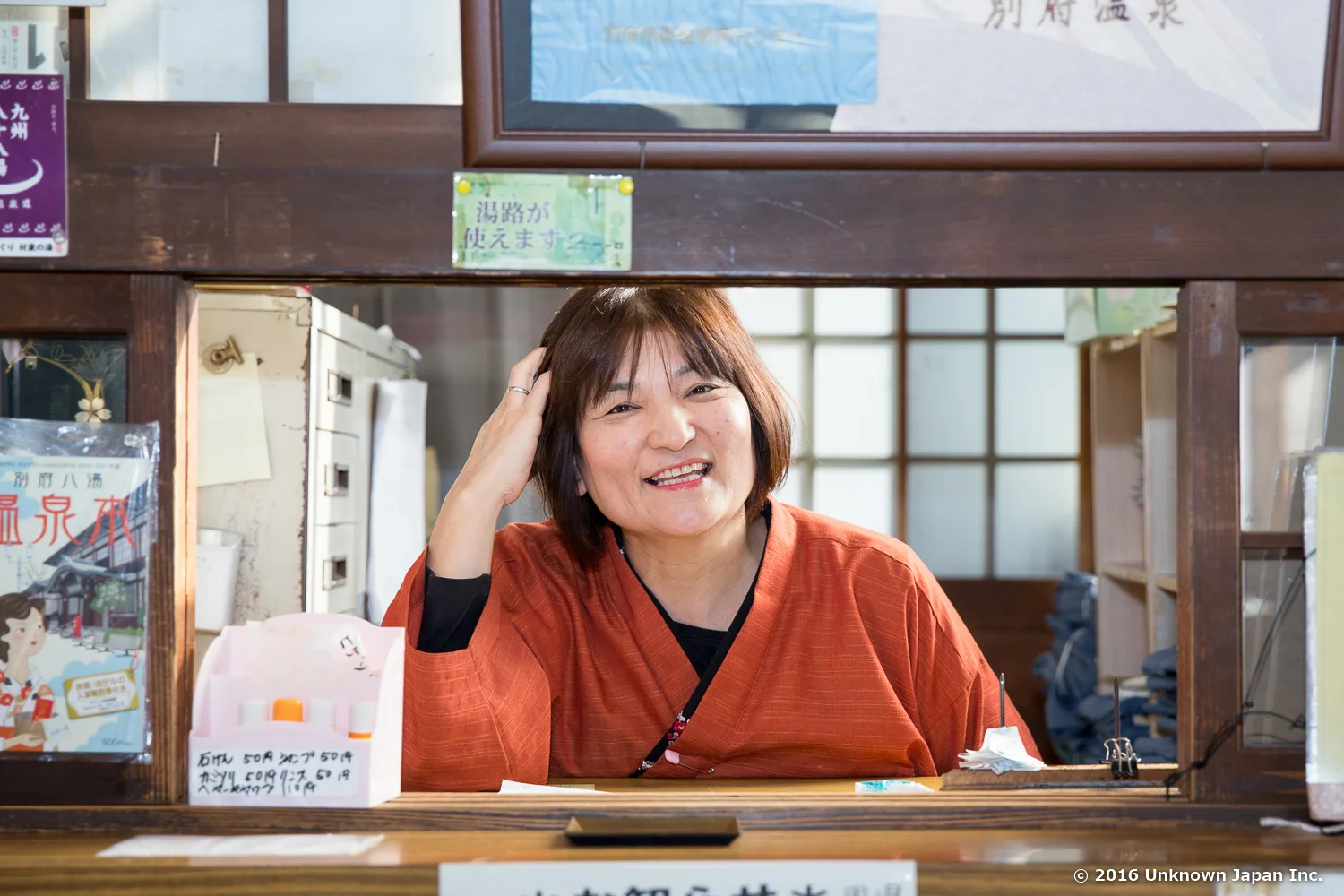 受付をされている節代さんです。大事にしていることは、お客さんひとりひとりとの会話をできるだけ丁寧に行うことだそうです。日本全国、さらに海外から様々なお客さんがいらっしゃるので、ひとつひとつの言葉のちょっとしたニュアンスの違いでトラブルになることもあり、気をつけているとのこと。また、毎日数十人いらっしゃる海外の方には英語で説明できるように勉強しているそうです。別府を象徴する温泉、さすがの心配りですね。