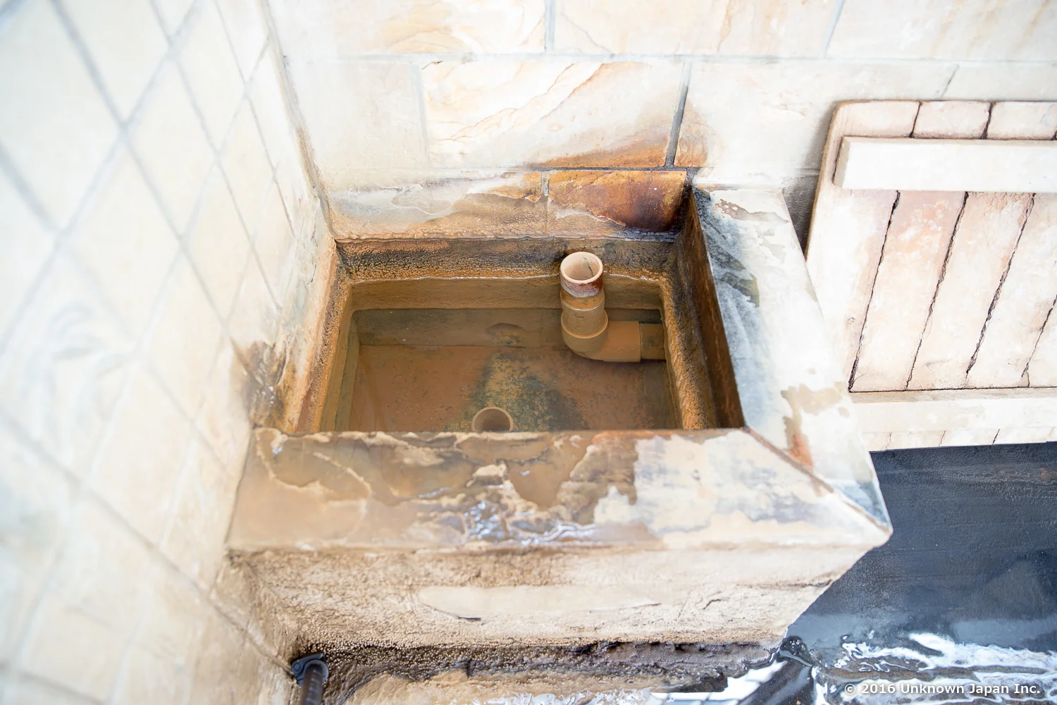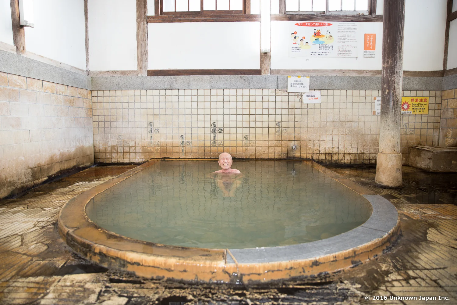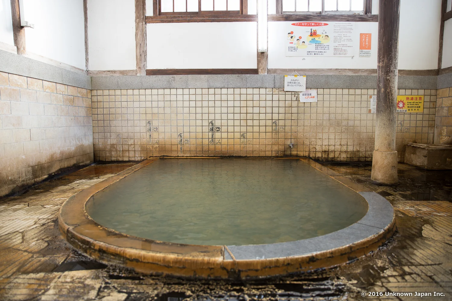 歴史を感じさせる浴室です。浴槽は大きめに作られています。別府の温泉は概ねそうですが、慣れていないと熱く感じると思います。節代さんによれば、平日の朝は45℃以上を好まれる常連さん向けに、土日の朝は観光客の方向けに加水して入りやすく温度設定しているそうです。