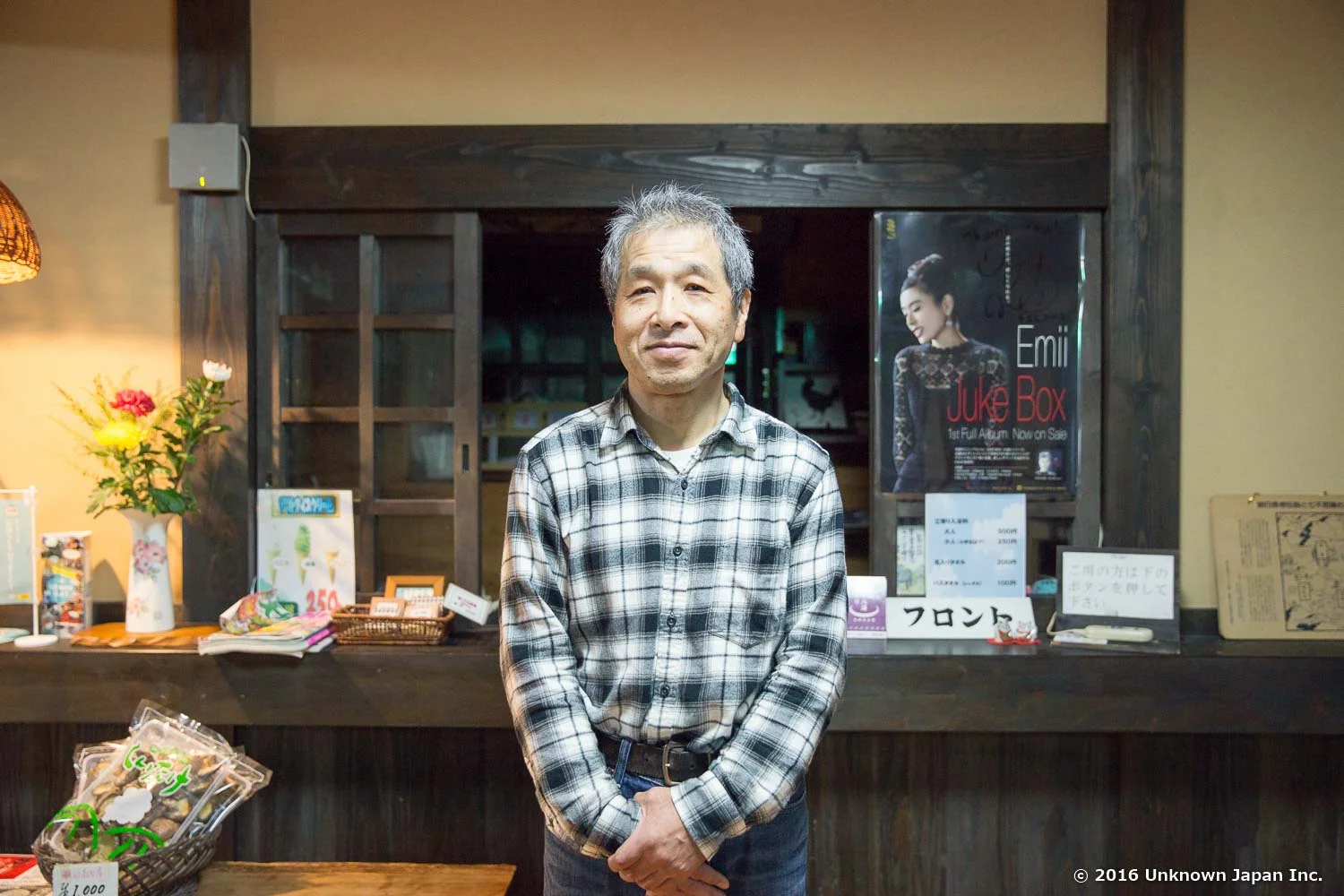 フロントでは弘明さんが出迎えてくれます。こちらの弘明さん、昔から美術が得意で、大学・社会人では化学を専攻して様々な実験をされていたそうなのですが、その持ち前のセンスと器用さを活かして、旅館の改装時には職人さんに混じって浴室・植栽・塗装などをご自身でも実施されたそうです。本当にそういうことが得意なんだと思うのですが、「自分でやるのは大変じゃないですか?」という問いに、悪びれず「(職人さんに任せるより)正直自分でやったほうが早い」と淡々とおっしゃっていたのが可笑しくてつい笑ってしまいました。