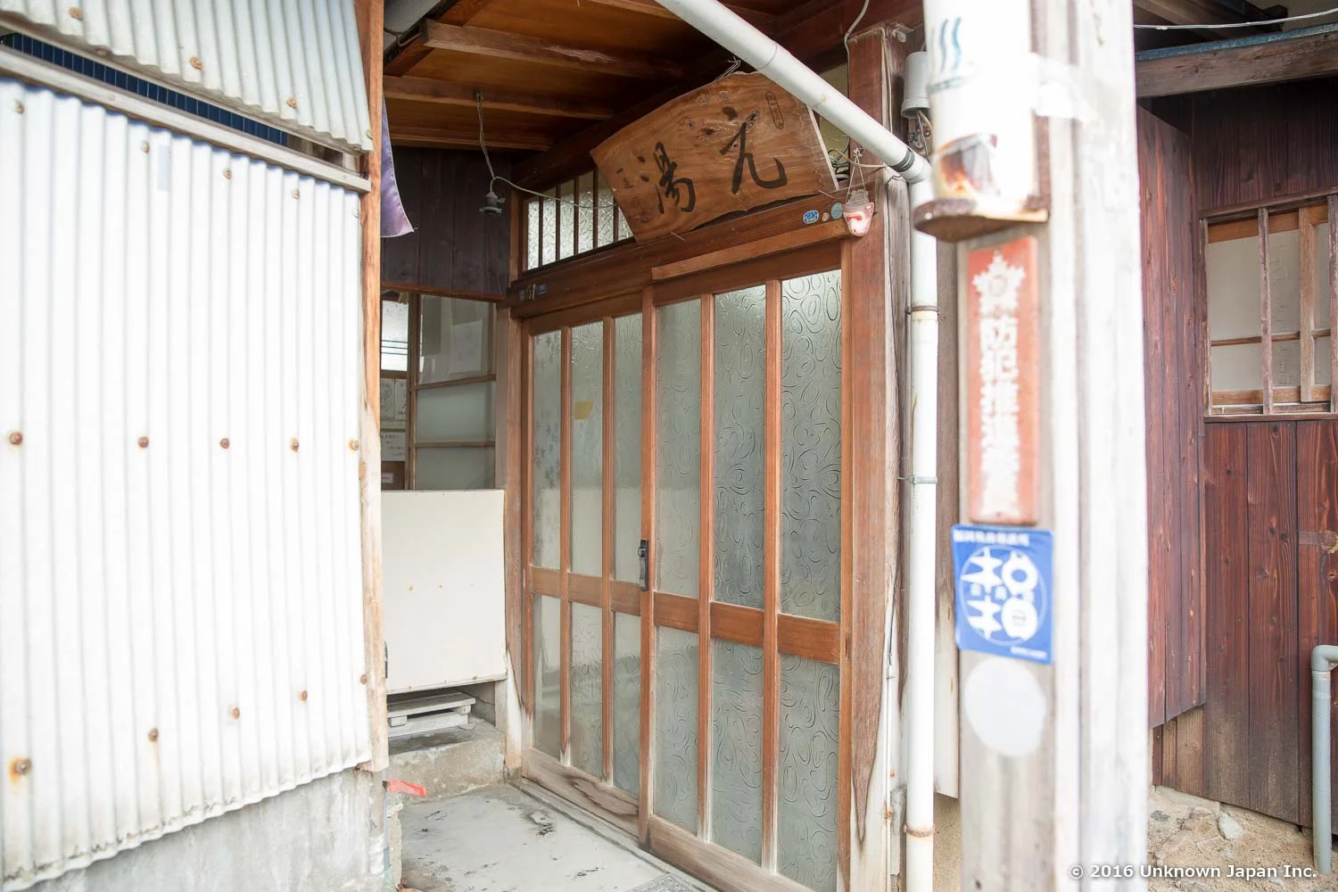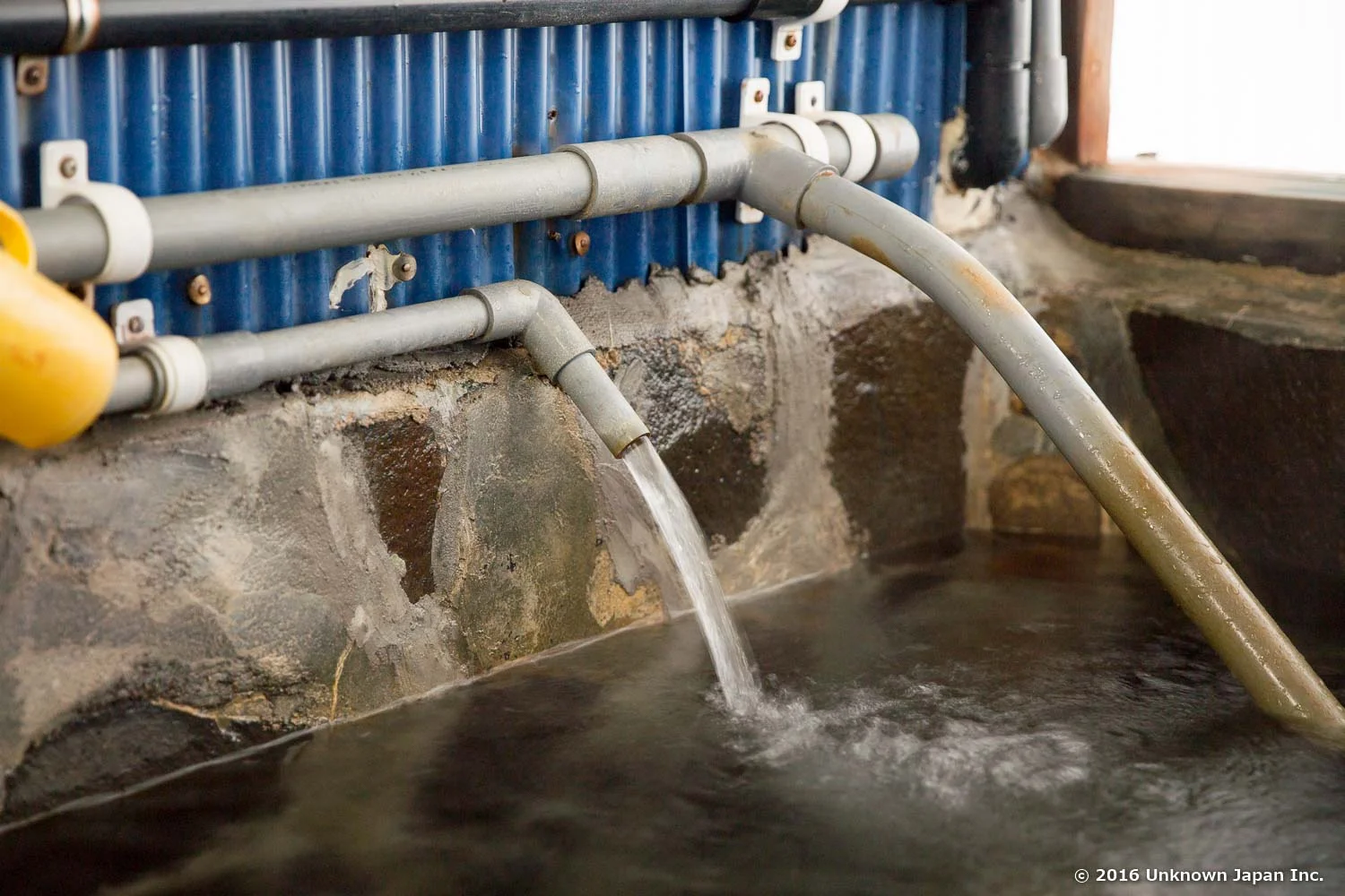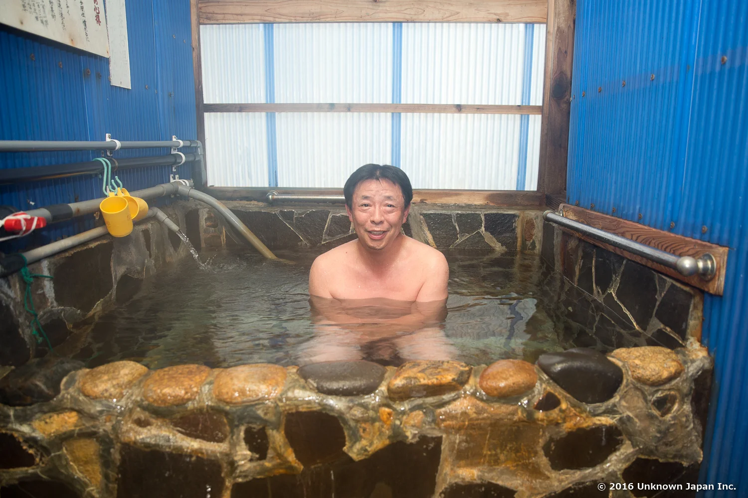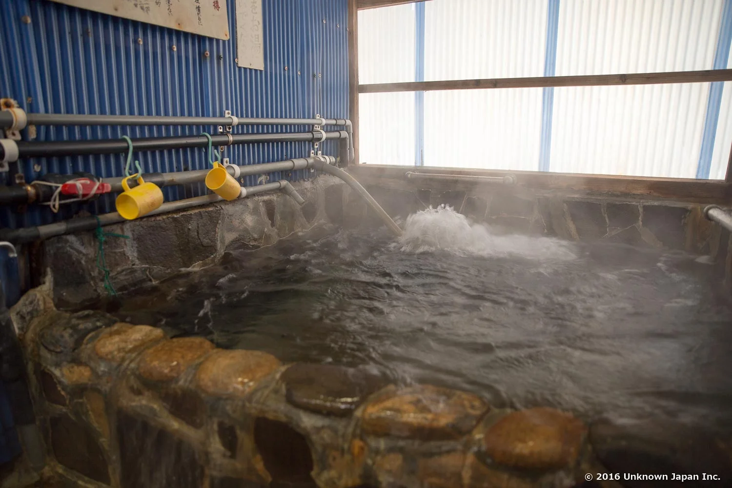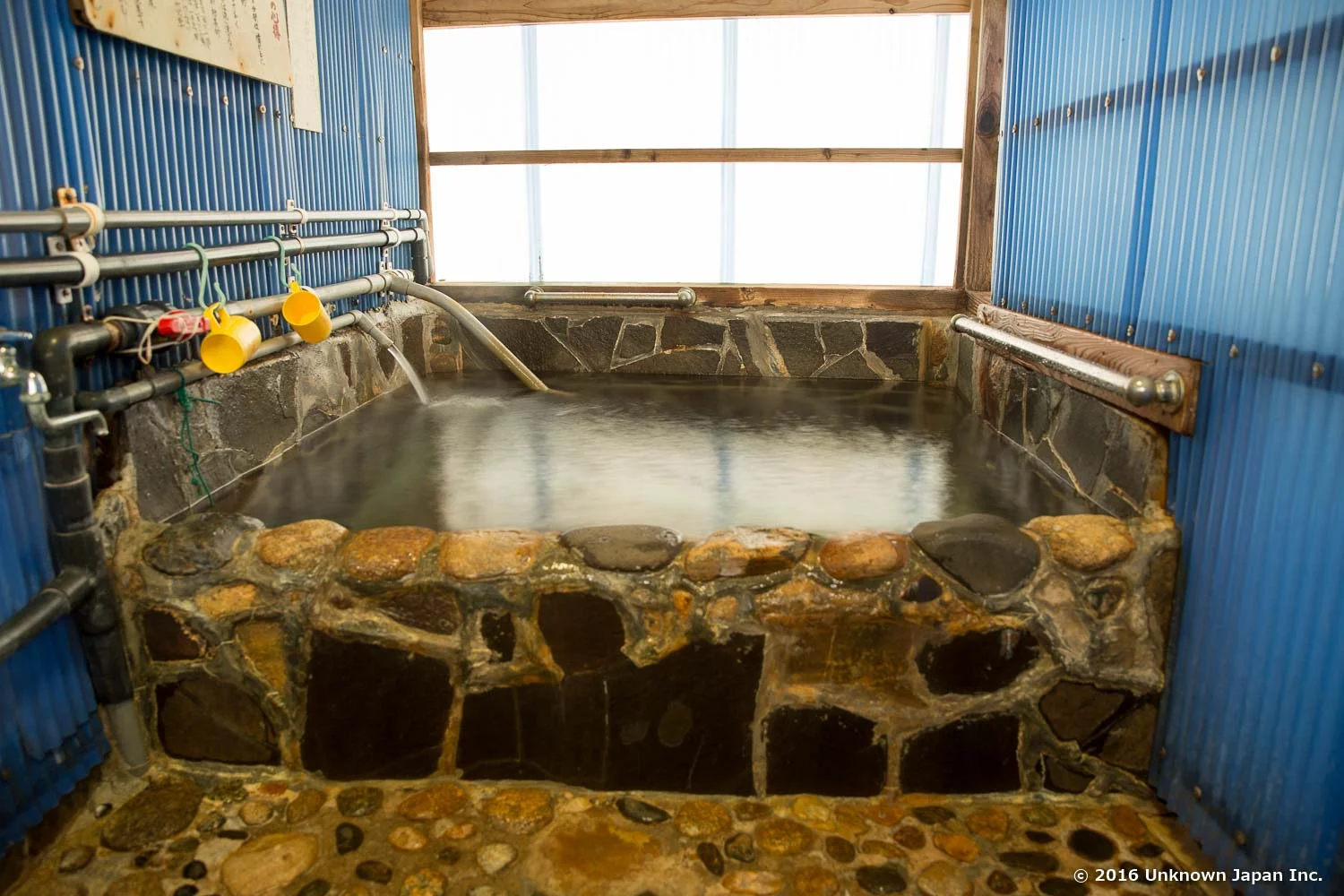 浴室です。ご家族で作られた小さな浴槽が置かれています。3人もいればいっぱいになってしまうこの浴槽に常連の方たちは譲り合いの精神で利用されていました。特筆すべきはお湯で、49℃の源泉がそのままかけ流されています。足をつけてみると、あ、熱い!本当に熱くて、長い間浸かっているのが耐えられないほどです。湯船から出て鏡を見ると、お湯に浸かっていた部分を示す真っ赤な線が(笑)。