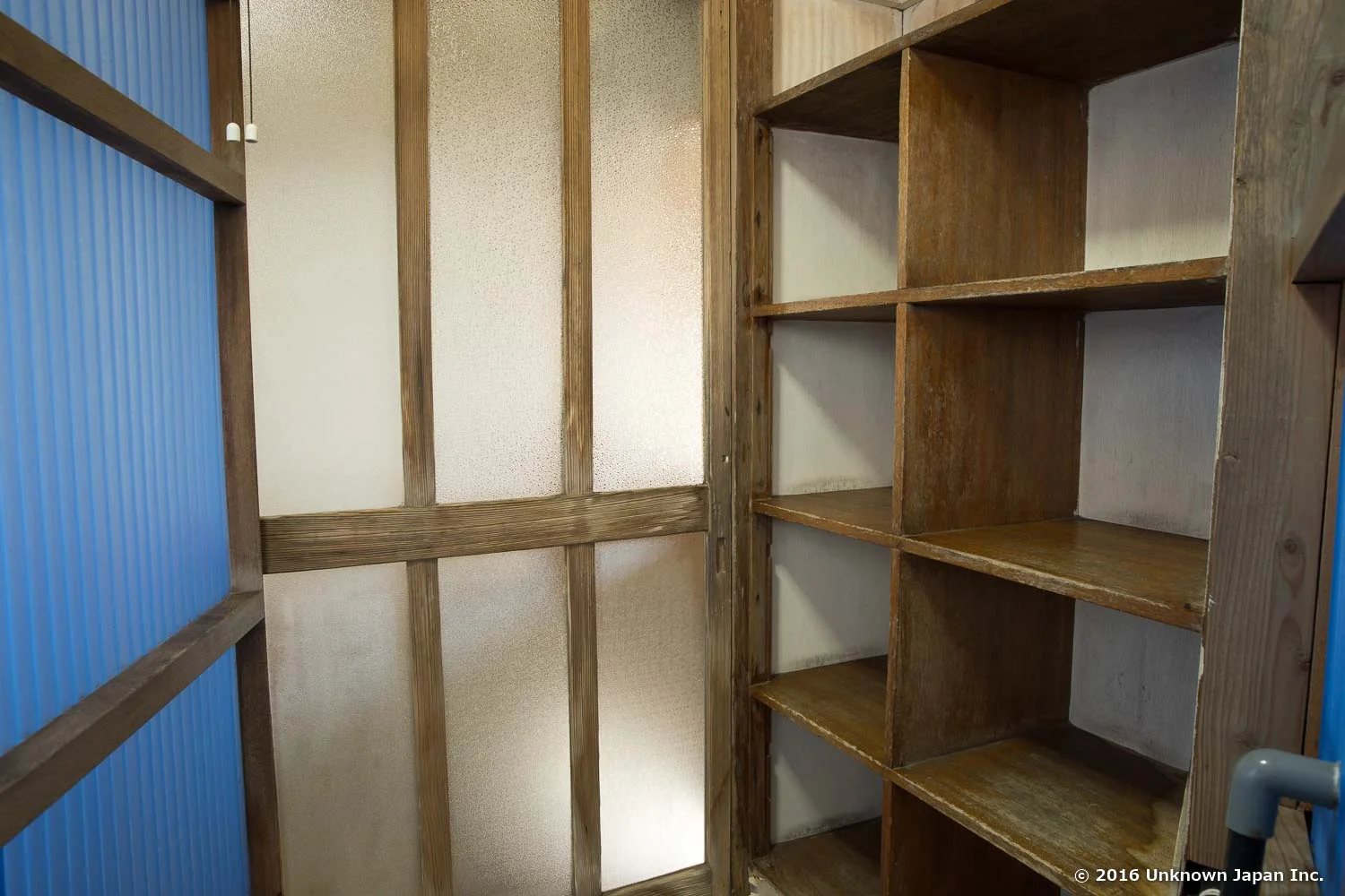 脱衣所は小さなスペースに棚が置かれています。見ての通り、広くないのであまり荷物は持ち込まず、車に置いてくるのが良いと思います。