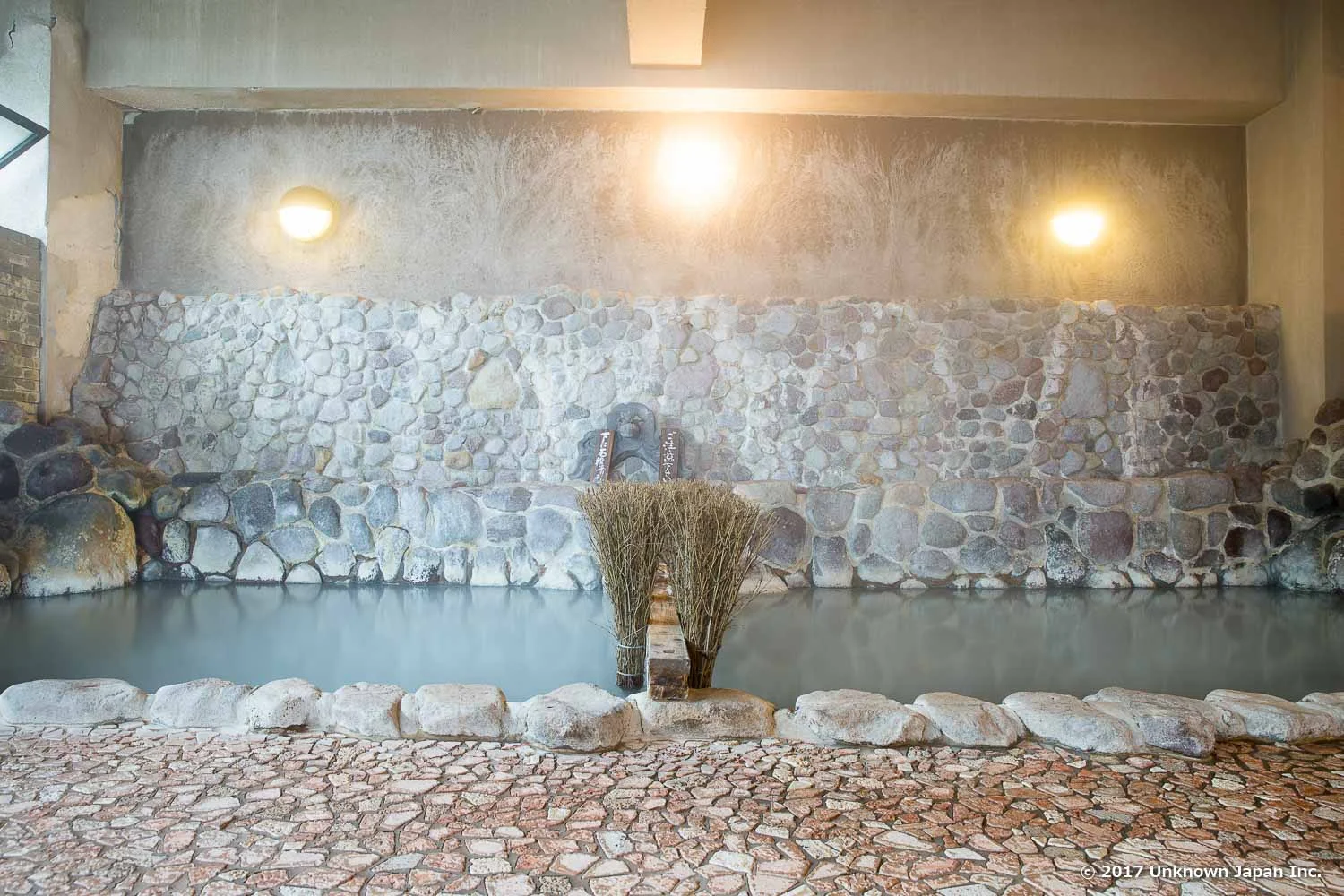 浴場に出ると真っ白なお湯が張られた大きな露天風呂が!常に硫黄を含む蒸気が吹き込まれています。とても豊かな香りでタオルに湯を浸して硫黄の香りを染み込ませ、持ち帰られる方もいらっしゃるのだとか。また、単純温泉の源泉も持っており、硫黄泉に浸かった後に単純温泉に入ると肌がツルツルになるそうです。こちらの温泉の1F は「風と歩く石畳」というテーマで作られており、広くて風通しの良い露天風呂や岩風呂、蒸し湯があります。