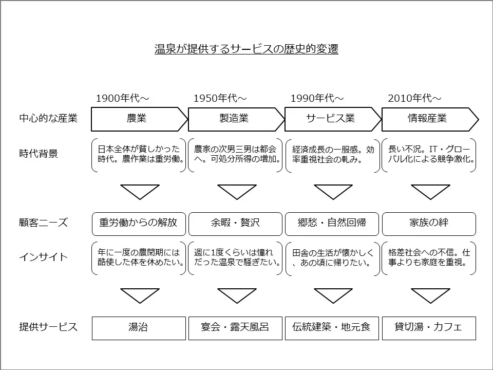 整理していく中でわかったことは、「温泉は進化していく」ということです。当然といえば当然の話なのですが、これは意外と認識されていない事実だと思います。僕にとっては再発見で、明るさを感じた瞬間でした。温泉はその時代の中心的な産業とそれに紐づく顧客ニーズの変化に合わせて、サービスを進化させてきたし、これからも進化していくはずです。