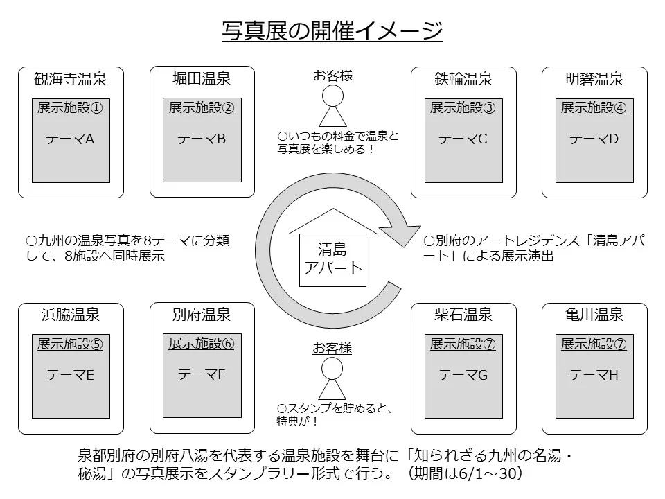 今回の写真展では温泉と写真とアートのコラボ展示を行います。九州の温泉写真をテーマ別に8つに分類し、別府八湯を代表する8施設に同時展示、展示の演出を別府のアートレジデンス「清島アパート」に依頼。入浴料を払えば、鑑賞は無料、いつもの料金で温泉と写真展、さらにはアートまで楽しむことができます。「温泉」「写真」「アート」の3つの組み合わせによって我々がテーマにしている「新しい世代や新しい顧客層の温泉めぐりへの入口を広げる」をどこまでパワフルに実行できるか、今からとても楽しみです。