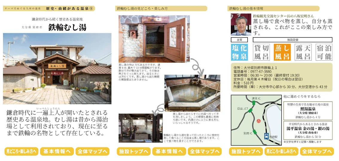 湯めぐりを愉しむための必要最小限の情報である、「施設概要」「見どころ・楽しみ方」「オーナーやスタッフによる紹介」「泉質や設備などの気になる情報」「住所・営業時間・料金などの基本情報」「施設の位置を示したマップ」をコンパクトに掲載しています。
