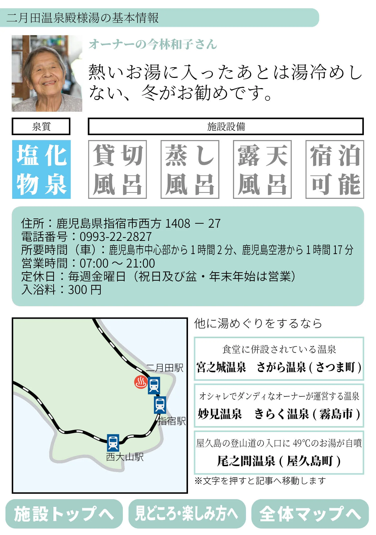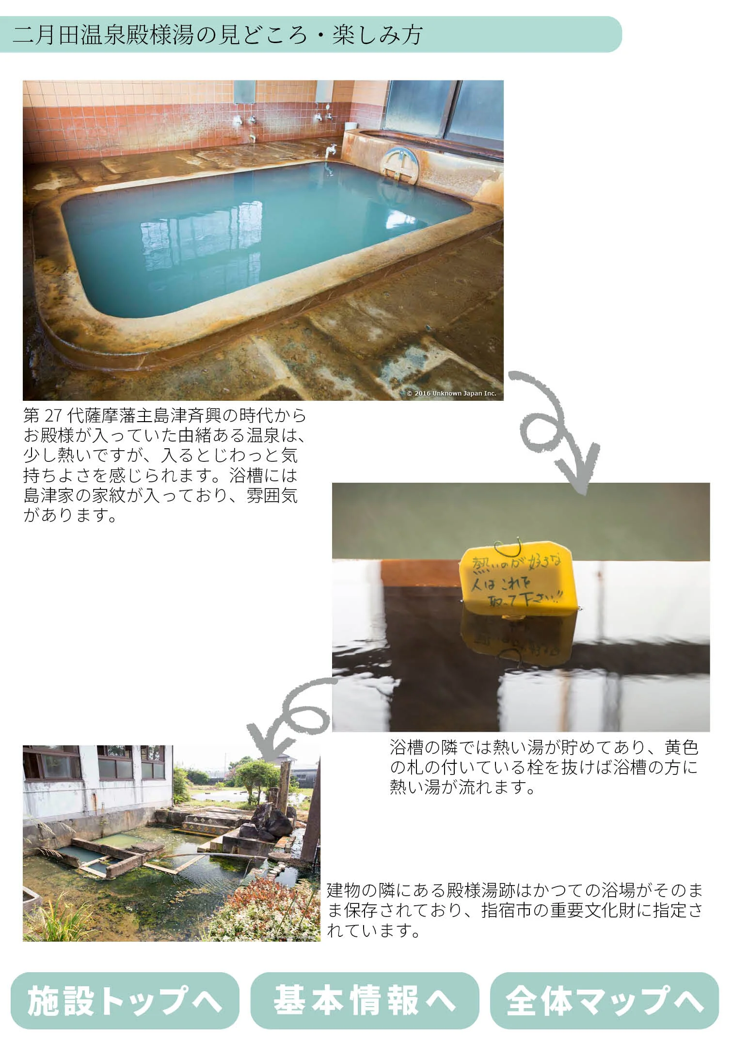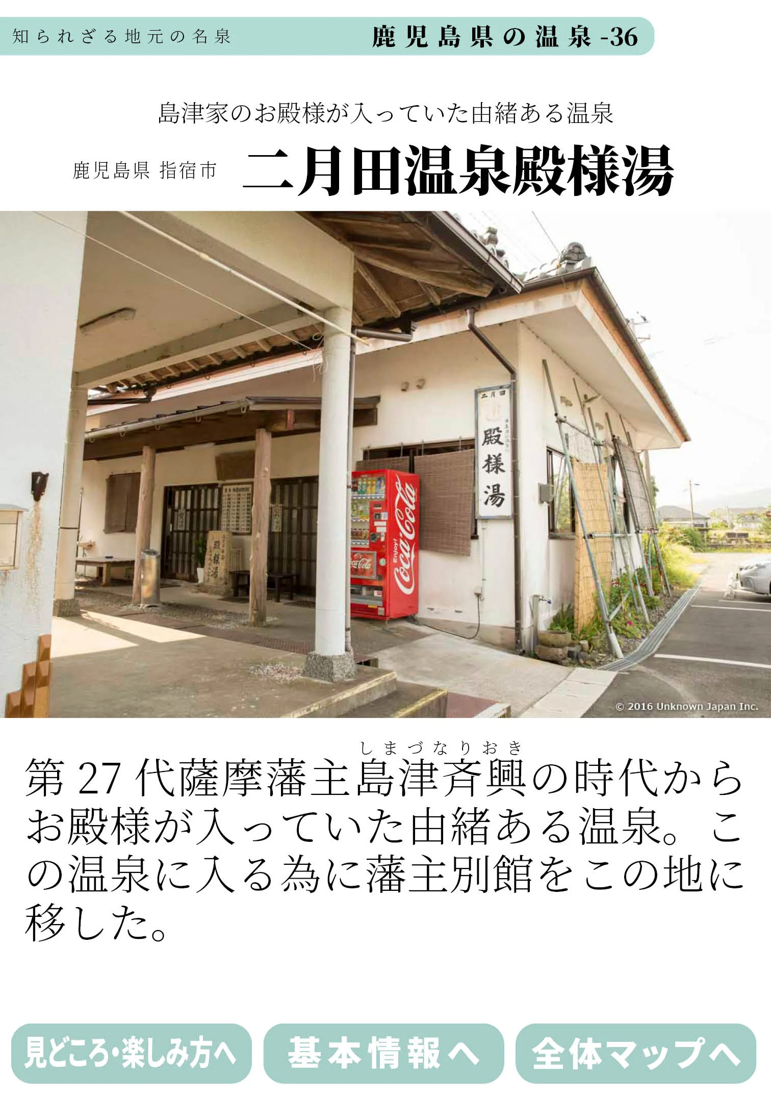 鹿児島県の名湯・秘湯を紹介する電子書籍です。湯めぐりを愉しむために必要な「見どころ・楽しみ方」「泉質や設備などの気になる情報」「住所・営業時間・料金などの基本情報」「施設の位置を示したマップ」コンパクトに掲載しています。